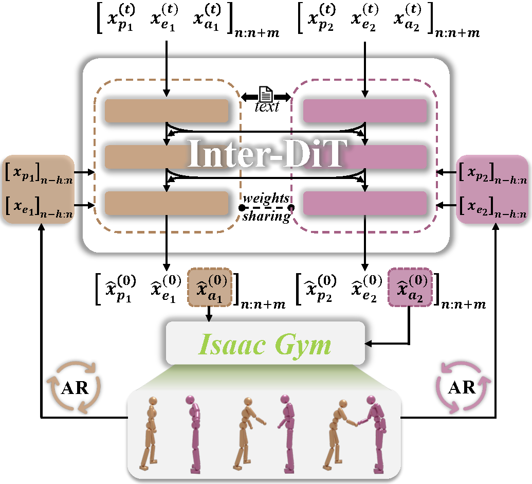 We focus on physics-based text-driven control for two interacting humanoid agents. In single-agent settings, actions depend mainly on an agent’s own state (proprioception). In contrast, multi-agent scenarios introduce additional challenges: each agent’s actions are influenced not only by its intrinsic dynamics but also by the other’s states and behaviors (exteroception). To this end, we propose a novel framework InterAgent. It incorporates an Interaction Diffusion Transformer (Inter-DiT), composed of two cooperative, weight-sharing networks under an autoregressive diffusion paradigm, to effectively model interactive dynamics. Given the inherent heterogeneity among proprioception, exteroception, and action, we treat them as distinct modalities. To handle these modalities in a coordinated manner, Inter-DiT adopts a multi-stream architecture that enables decoupled yet cooperative modeling and enhances overall performance. Moreover, we propose a novel and effective exteroception representation, interaction graph (IG), and devise a tailored edge-based sparse attention mechanism on the exteroception stream to selectively suppress interaction-irrelevant connections and effectively highlight salient inter-agent relations, based on its sparsity nature.